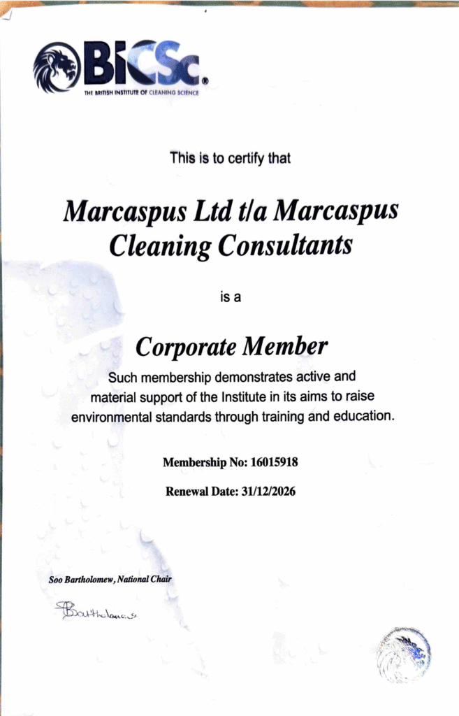 Marcaspus Cleaning Consultants operates to recognised UK professional and compliance standards within the industry. We are a Corporate Member of the British Institute of Cleaning Science (BISCs), demonstrating our commitment to professional training, best practice, and continuous improvement . We are also CHAS Advanced Certified, confirming that our health and safety management system meet established UK compliance requirements.